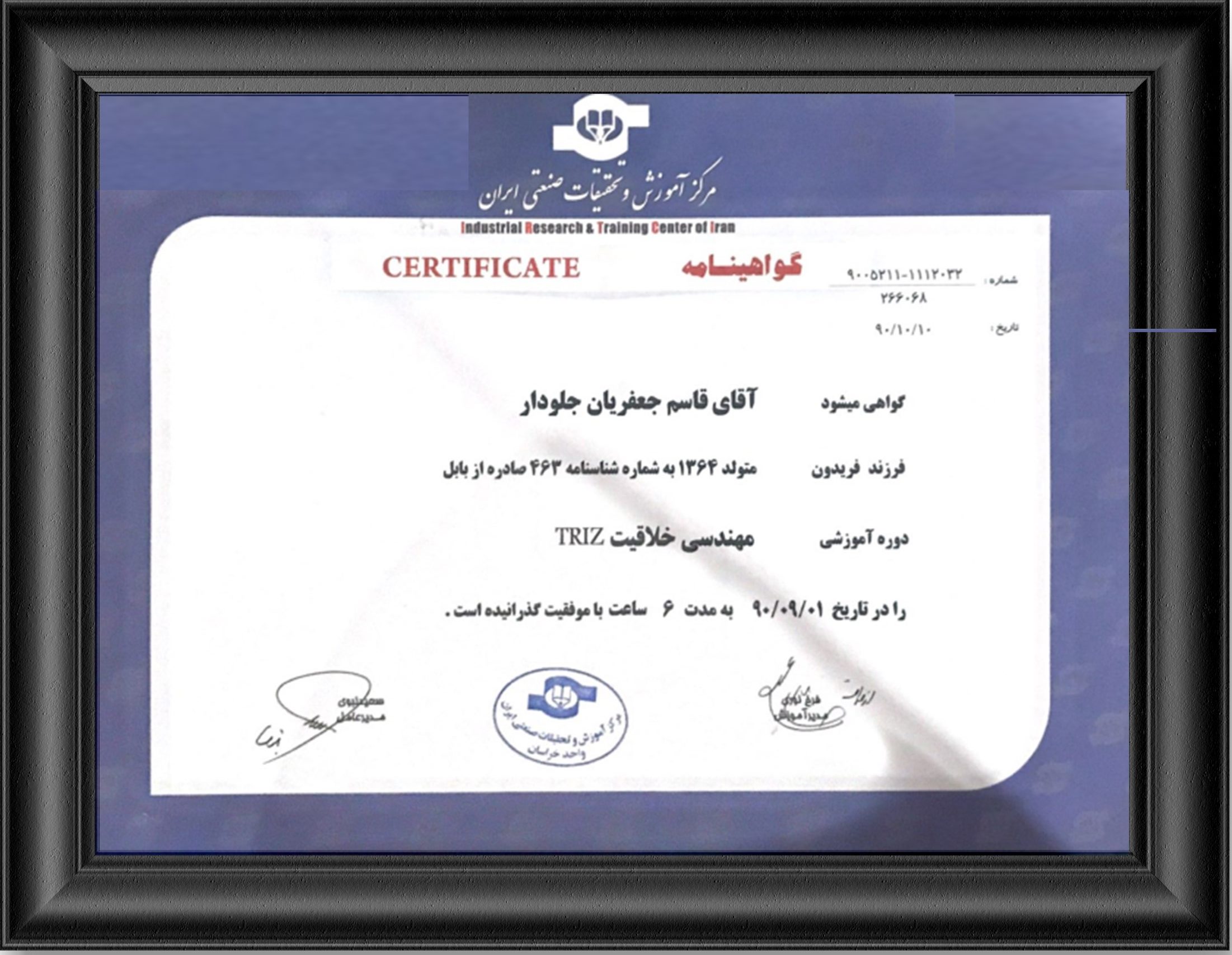 گواهینامه مهندسی خلاقیت (TRIZ)از مرکز آموزشی و تحقیقات صنفی ایران